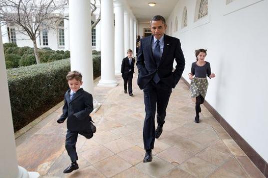 "On a cold day, the President races down the Colonnade with Denis McDonough's children en route to the announcement that Denis would become the new Chief of Staff."