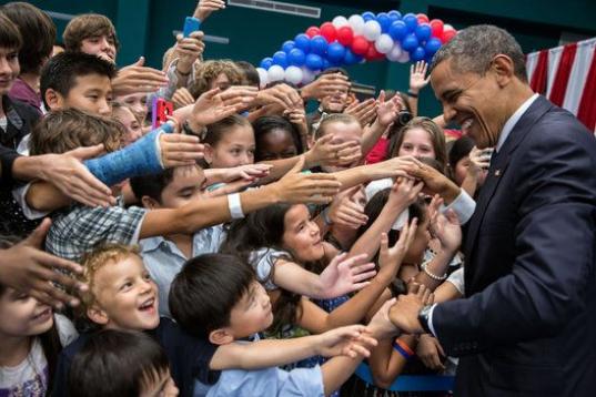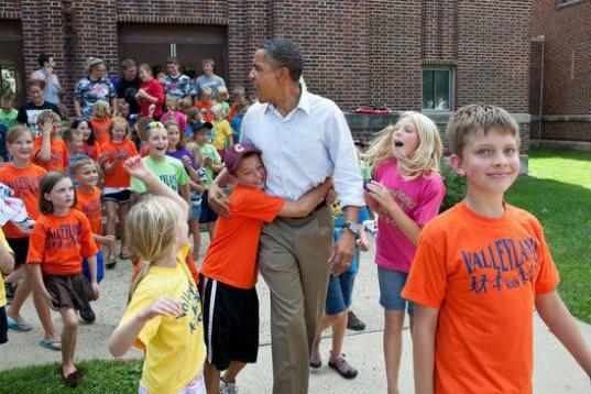 President Barack Obama greets children from the Valleyland Kids summer program outside a school in Chatfield, Minn., during a three-day bus tour in the Midwest, Aug. 15, 2011. (Official White House Photo by Pete Souza)