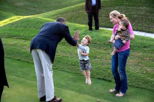 President Barack Obama greets a child on the Kingsmill Resort grounds during a break from debate prep in Williamsburg, Va., Oct. 14, 2012. (Official White House Photo by Pete Souza)