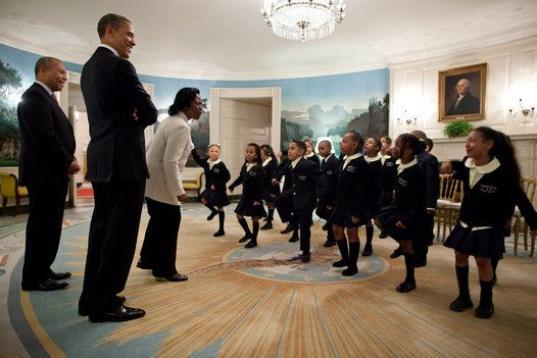 President Barack Obama and Massachusetts Gov. Deval Patrick listen as students from Orchard Gardens K-8 School in Roxbury, Mass., perform Dr. Marin Luther King Jr.'s "I Have a Dream" speech in the Diplomatic Reception Room of the White House, Fe...