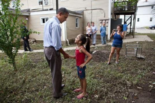 President Barack Obama greets a girl while touring a neighborhood affected by Hurricane Irene in Wayne, N.J., Sept. 4, 2011. (Official White House Photo by Pete Souza)