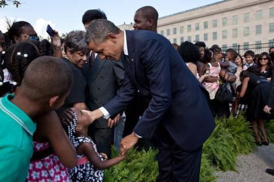 President Barack Obama and First Lady Michelle Obama greet guests at the Pentagon in Arlington, Va., on the tenth anniversary of the 9/11 attacks against the United States, Sunday, Sept. 11, 2011. (Official White House Photo by Pete Souza)