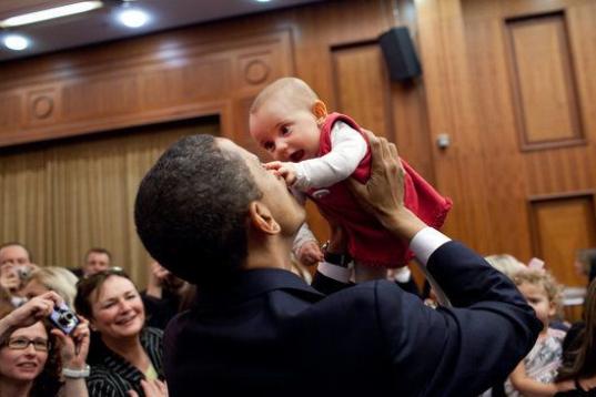President Obama lifts up a baby April 4, 2009, during the U.S. Embassy greeting at a Prague hotel. (Official White House Photo by Pete Souza)