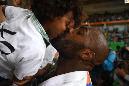 El campeón olímpico Teddy Riner besa a su hijo Eden tras vencer en la prueba final de judo +100kg en Río de Janeiro.