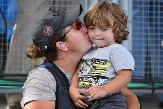 Kimberly Rhode besa a su hijo Carter tras ganar la medalla de bronce en Río el 12 de agosto.