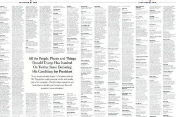 El diario The New York Times ha llegado este lunes a los periódicos con una curiosa doble página en su interior. El prestigioso periódico estadounidense le ha presentado a sus lectores la recopilación completa de los insultos que Donald Trump ha proferido en Twitter desde que es candidato a la Casa Blanca.