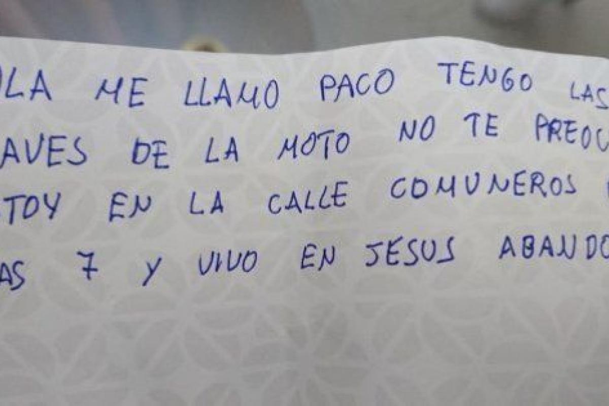 El joven explicó, a través de su publicación, que "Paco es un indigente que no tiene nada. El tipo ha encontrado las llaves de mi moto al lado de ésta y me ha dejado escrita esta nota".