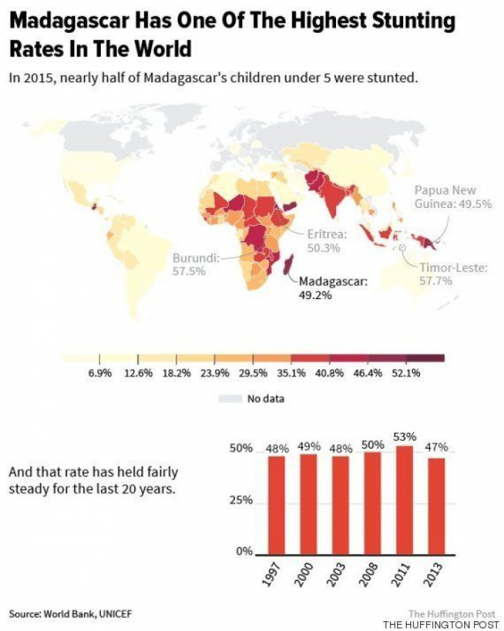 El Programa Nacional de Madagascar sobre la Nutrición, que trabaja por educar a la población de las 22 regiones sobre los efectos de la malnutrición crónica, se detuvo en 2009 debido a la agitación política. El programa se retomó en 2013 después de las elecciones presidenciales democráticas, con las que se recuperó la mayor parte de la ayuda exterior, pero ahora sólo llega a las nueve regiones más necesitadas.