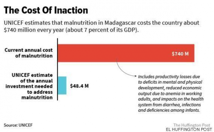 La malnutrición cuesta a Madagascar 740 millones de dólares al año, lo que equivale a un 7% de su PIB. Según UNICEF, bastaría con invertir 48,4 millones de dólares para empezar a reducir la malnutrición.