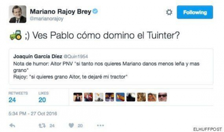 Parece que el todavía presidente en funciones ha aprovechado el descanso de la comida para hacer prácticas en Twitter y no sólo ha tuiteado sino que, además, ha añadido el emoticono del tractor y el símbolo del guiño en la respuesta a este usuario.