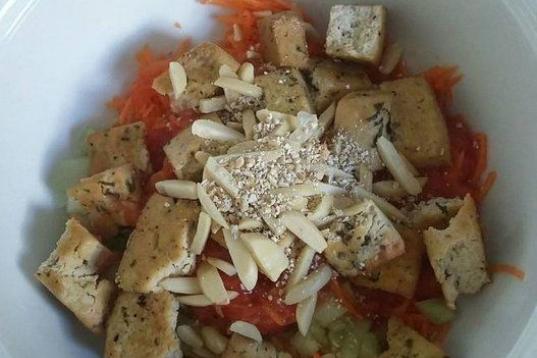 El tofu va acompañado de calabacín, zanahora y cebollino. Si quieres experimentar este plato sólo tienes que seguir estos cinco pasos.