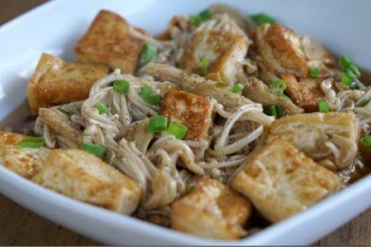 Se necesitan setas, tofu, ajo, cebollino, salsa de soja y de ostras, fécula de maíz, agua, aceite vegetal y pimienta blanca. Puedes ver en Cookpad cómo prepararla o seguir los pasos de este vídeo.