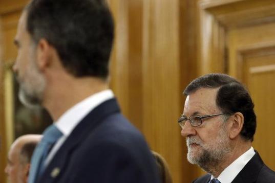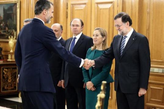 El rey Felipe VI saluda al jefe del Ejecutivo, Mariano Rajoy, en presencia de la presidenta del Congreso, Ana Pastor, y el presidente del Senado, Pío García Escudero.