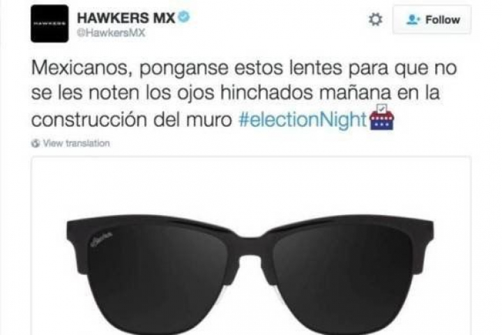 "Mexicanos, pónganse estos lentes para que no se les noten los ojos hinchados mañana en la construcción del muro", decía el polémico tuit, que añadía la etiqueta: #electionNight.