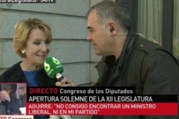 La cita, de apenas unos minutos, ha sido en el Congreso de los Diputados, donde el periodista de LaSexta ha acudido como reportero (sí, como oyen) y donde Aguirre lo ha hecho en calidad de portavoz del PP en el Ayuntamiento de Madrid y expresidenta de la Comunidad de Madrid.