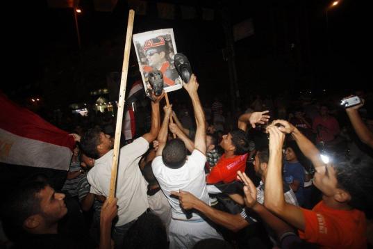 Manifestantes palestinos golpean con zapatillas la foto del jefe del Ejército egipcio, el general Abdel Fattah al-Sisi, durante una marcha en favor del depuesto presidente Morsi en la parte sur de la franja de Gaza.