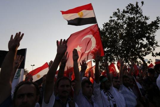 Manifestantes turcos a favor de Morsi ondean banderas de Egipto y de Turquía, el único país que ha calificado la deposición del presidente egipcio de "golpe de Estado".