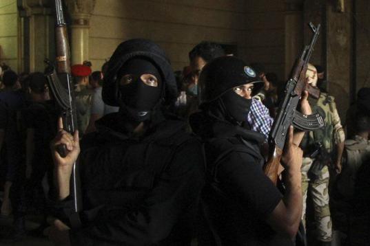 Dos policías egipcios montan guardia en una habitacion de la mezquita al-Fath, que ha servido de refugio a los partidarios del depuesto Morsi y donde partidarios del Ejército y seguidores de los Hermanos Musulmanes tuvieron un tiroteo durante ...