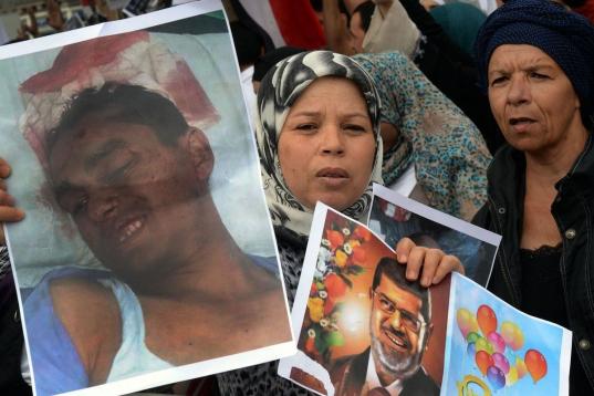 Una mujer muestra, en una marcha en favor de Morsi en París, una fotografía del depuesto presidente egipcio y otra de un hombre herido durante los enfrentamientos del día de la ira.