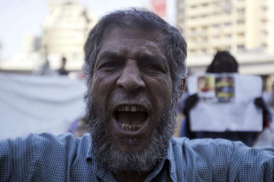Un simpatizante de los Hermanos Musulmanes grita en contra del Ejército y el Ministerio del Interior durante las protestas en la mezquita Al Istkama en la plaza de Giza, al sur de El Cairo.