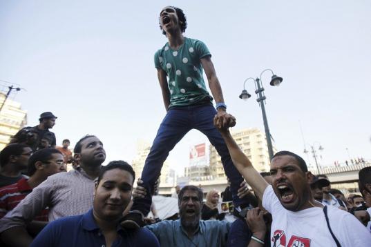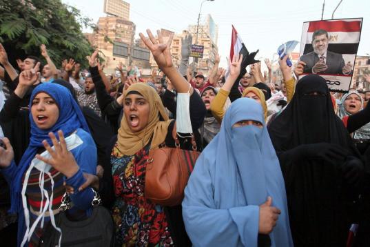 Mujeres musulmanas protestan en la plaza cairota Roxy por los muertos durante los enfrentamientos.