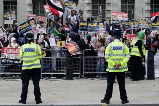 Más de 100 manifestantes mostraron su apoyo a Morsi el domingo frente al número 10 de Downing Street, residencia del Primer Ministro británico, en el centro de Londres.