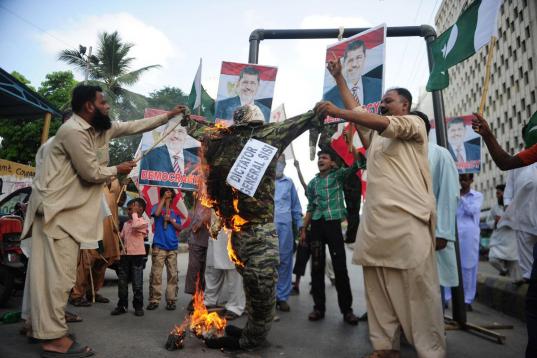 Manifestantes a favor de Morsi queman un muñeco a imagen y semejanza del general egipcio Abdel Fattah al-Sisi durante una marcha en Karachi, Pakistán.