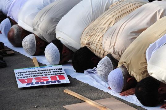 Activistas de la rama estudiantil del partido islámico pakistaní Jamaat-e-Islami ofrecen sus rezos durante una protesta en Islamabad, Pakistán.