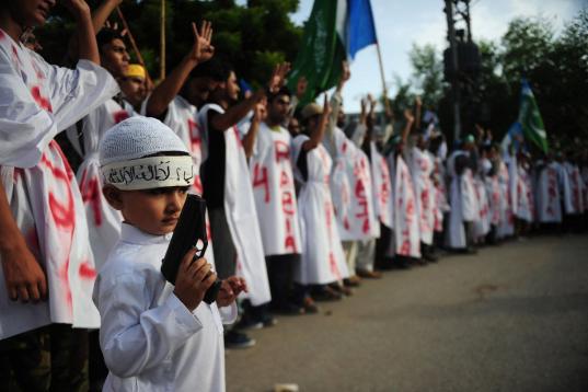 Activistas de la rama estudiantil del partido islámico pakistaní Jamaat-e-Islami visten sudarios con lemas a favor de los Hermanos Musulmanes y los partidarios de Morsi fallecidos durante las protestas.