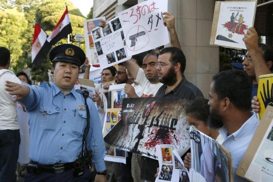 Un agente japonés trata de controlar la protesta de egipcios residentes en Japón a favor de Morsi frente a la embajada de Egipto en Tokio.