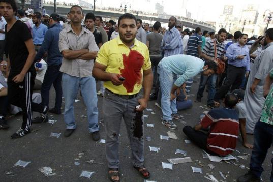 Un manifestante a favor de los Hermanos Musulmanes marcha con las ropas ensangrentadas por el barrio de Abbassiya en El Cairo durante el pasado viernes de la ira.