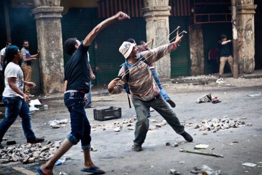 Simpatizantes de Morsi y los Hermanos Musulmanes lanzan piedras a las fuerzas de seguridad en la plaza de Ramsés durante los enfrentamientos del viernes de la ira.