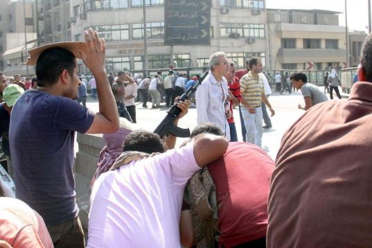 Simpatizantes de los Hermanos Musulmanes, uno de ellos armado, durante las protestas en el puente del 15 de mayo en El Cairo.