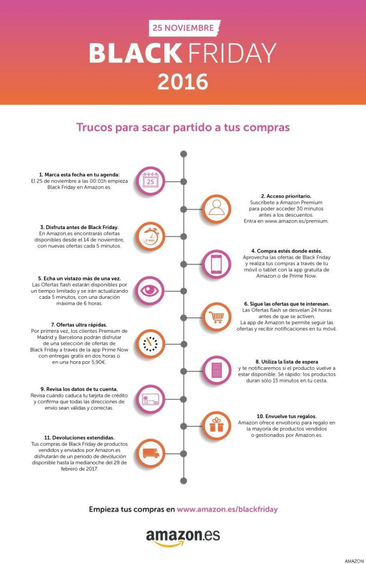 En Amazon.es, donde habrá más de 2.400 ofertas, han elaborado una lista de consejos para que sus usuarios disfruten y aprovechen de las ventajas que este día ofrece al bolsillo. Las ofertas en la web empezarán a las 00:01 de la noche del viernes y se intensificarán a primera hora de la mañana, de ahí que haya que estar atento y no perder de vista el ordenador.