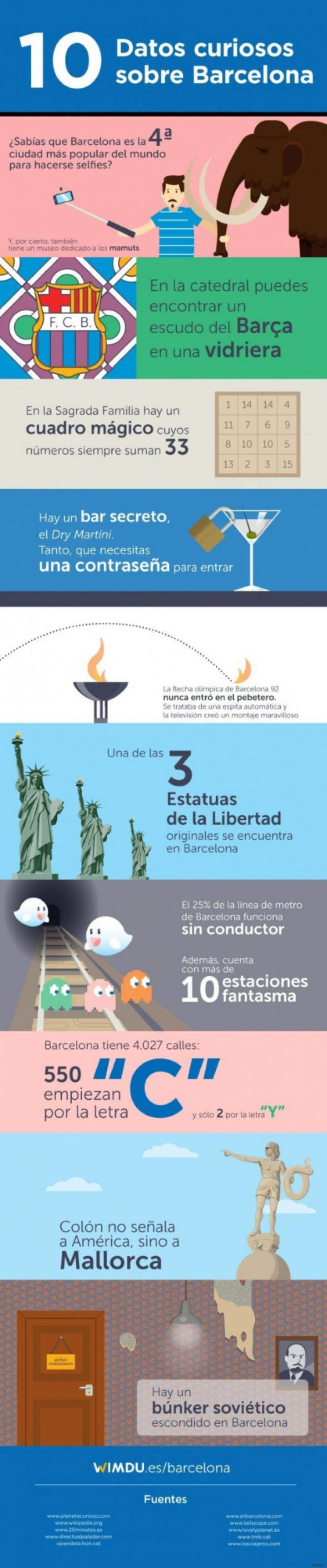 Diez de esos datos curiosos se recogen en esta infografía elaborada por Wimdu. ¿Sabías que hay un Dry Martini secreto al que sólo se puede acceder con contraseña y que el escudo del Barça tiene un hueco en las vidrieras de la Sagrada Familia? Aquí, otros ocho datos para quedarse con el personal.