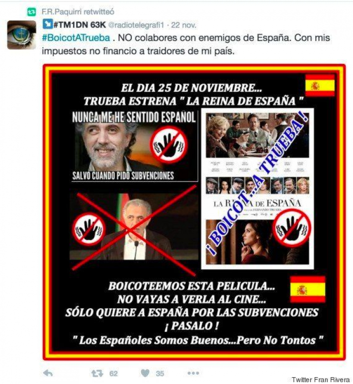 Desde algunos sectores —ofendidos por las palabras sobre España— están intentando boicotear la película de Trueba bajo la etiqueta #BoicotATrueba.