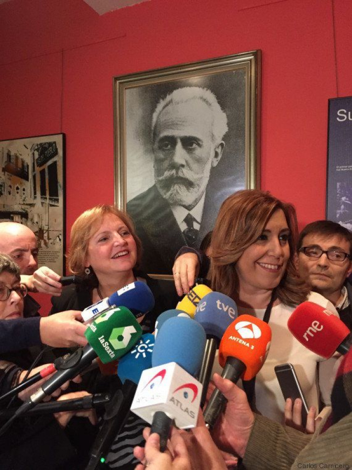 "Estoy centrada en Andalucía", una especie de esto no es lo que parece en lenguaje magrittiano, dijo a los periodistas bajo la atenta mirada de un retrato en blanco y negro de Pablo Iglesias, fundador del PSOE. Sobre sus intenciones para ser secretaria general, una respuesta conocida: "Yo voy a estar donde quieran mis compañeros; en la cola, en la cabeza, con ilusión y ganas, pero ahora eso no toca". Preguntada por las polémicas palabras del otro Pablo Iglesias en relación a las mujeres y la política, dijo: "No me sorprende, no es la primera vez que enseña la patita. Sí que creo que tiene que haber más mujeres en política, en puestos de responsabilidad en las empresas, al frente de los medios de comunicación. Nuestro país no se puede permitir que la mitad de la inteligencia quede relegada". Un cartel con la fotografía de Clara Campoamor acompaña la escena a pocos metros.