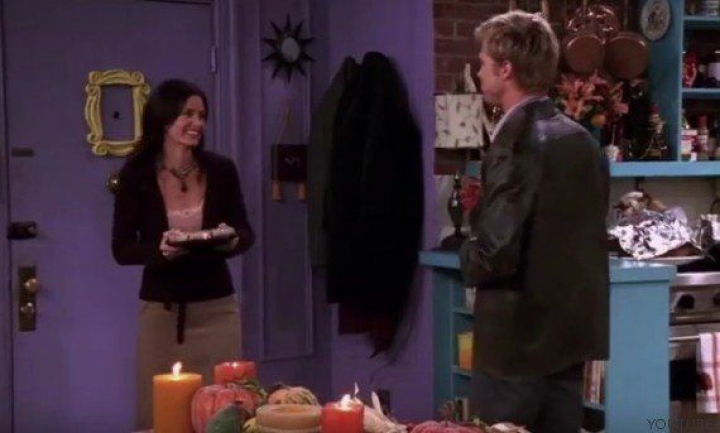 Pero seguro que este detalle se os había pasado por alto. Fijaos en la primera escena de Pitt. Cuando entra al piso de Monica y Rachel trae un pastel que entrega a Monica y que ésta decide dejar encima de la mesita que hay junto a la puerta.