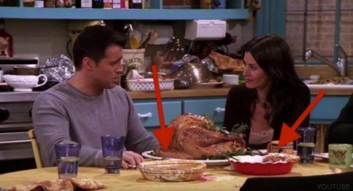 Pero ya casi al final del episodio, cuando Joey regresa de ponerse sus pantalones de chándal para poder zamparse entero el pavo de Acción de Gracias que ha preparado Monica, observamos que, ¡sorpresa!, el pastel ha desaparecido.