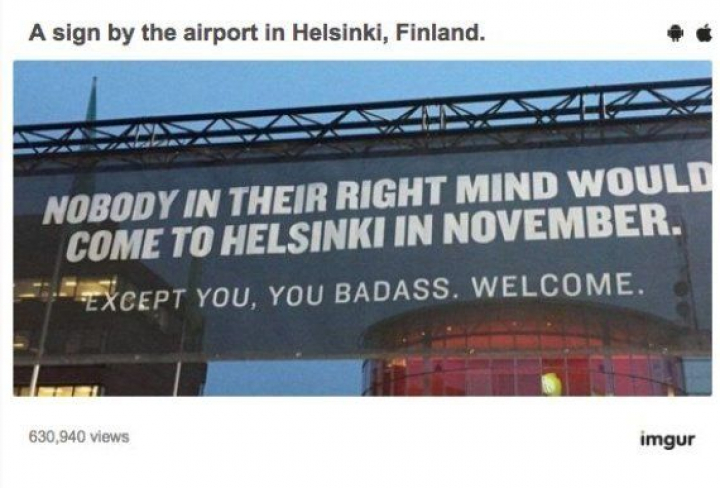 "Nobody in their right mind would come to Helsinki in november. Except you. You badass. Welcome", se podía leer en inglés. En castellano sería algo así como: "Nadie en su sano juicio vendría a Helsinki en noviembre. Excepto tú. Tú eres formidable, Bienvenido".