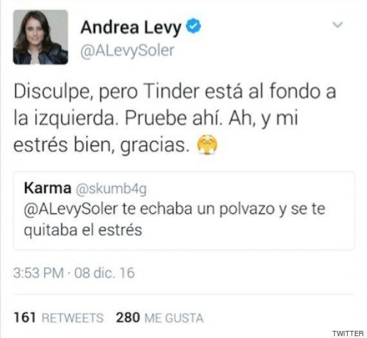 La respuesta de Andrea Levy a un tuit machista que ofrecía quitarle "el estrés"