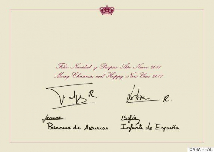 En el interior de la tarjeta se puede leer "Feliz Navidad y próspero año nuevo 2017", tanto en español como en inglés. Debajo firman los cuatro: Felipe y Letizia con una "R" (de reyes) tras su nombre; Leonor como Princesa de Asturias y Sofía como infanta de España.