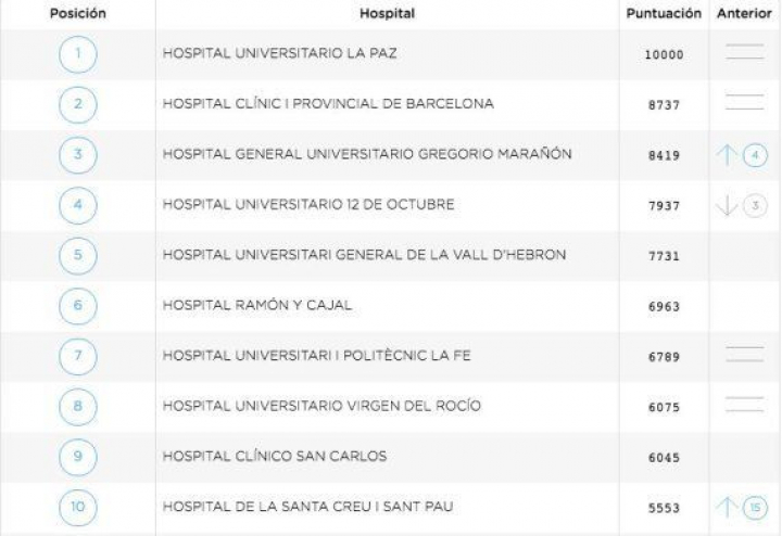 La lista, que se realiza desde 2014, se mantiene prácticamente sin cambios en el ámbito público. Estos son los primeros puestos de la lista de sanidad pública: