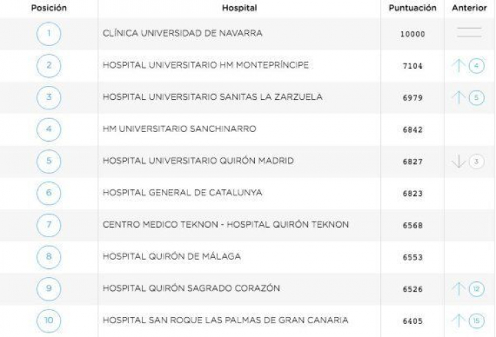 En cuanto a la sanidad privada, un año más sobresale la Clínica de Navarra como el hospital con mayor reputación, seguido del HM Montepríncipe y el Sanitas La Zarzuela, los dos madrileños. Estos son los primeros puestos de la lista: