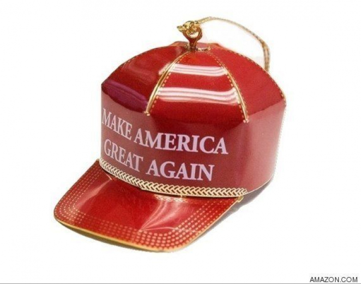 Todos estamos inmersos en el momento bolitas rojas y doradas para decorar la casa. En Estados Unidos, tras la victoria de Donald Trump en las elecciones presidenciales, todo se ha vuelto rojo... con forma de gorra y con su nombre. Amazon vende y distribuye un colgante para el árbol de Navidad que es una reproducción de la visera roja que el presidente electo no se quita de la cabeza y que lleva escrito su eslogan de campaña: Make America Great Again.