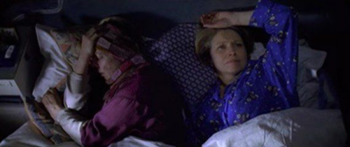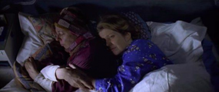 Tras hablar sobre lo que van a cenar y hacer un par de bromas más, vemos a las dos mujeres en la cama. Geraldine duerme mientras a la directora le cuesta conciliar el sueño. Entonces, Geraldine tose y la directora la abraza para consolar su sufrimiento.