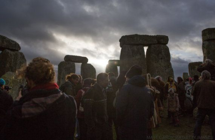 El sol se asoma entre las nubes durante la ceremonia del solsticio de invierno en el antiguo monumento neolítico de Stonehenge (Wiltshire, Inglaterra) el 22 de diciembre de 2015.