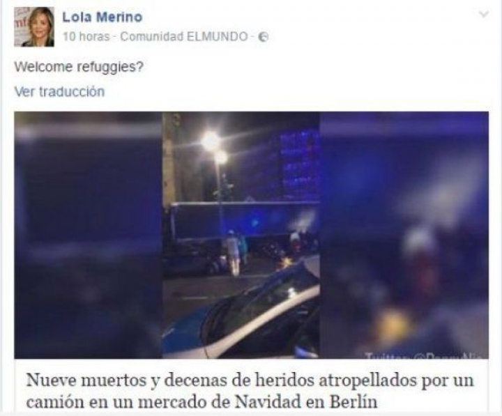 Lola Merino, diputada del PP en las Cortes de Castilla-La Mancha, ha borrado un comentario que había hecho en Facebook este lunes, después del atentado de Berlín en el que han muerto 12 personas y han resultado heridas otras 48.