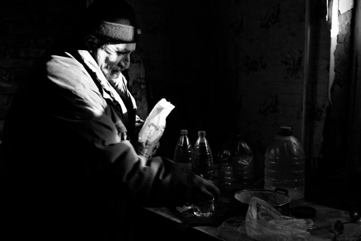Su mujer y su hija han huido, como han huido ya muchos de sus vecinos atrapados en el fuego: unos hacia Kiev, otros a Rusia. A su alrededor solo quedan calles desoladas, casas mutiladas y solares llenos de escombros. Según el Alto Comisionado de las Naciones Unidas para los Refugiados (ACNUR), casi tres millones de personas se han visto obligadas a dejar sus hogares desde el inicio de una guerra que ya cuenta con diez mil muertos. Los desplazados dentro de su propio país (1.7 millones) todavía se enfrentan a inmensos retos para integrarse, y el otro millón permanece en la zona de conflicto, donde las continuas hostilidades y la interrupción de los servicios hacen de su día a día una lucha.