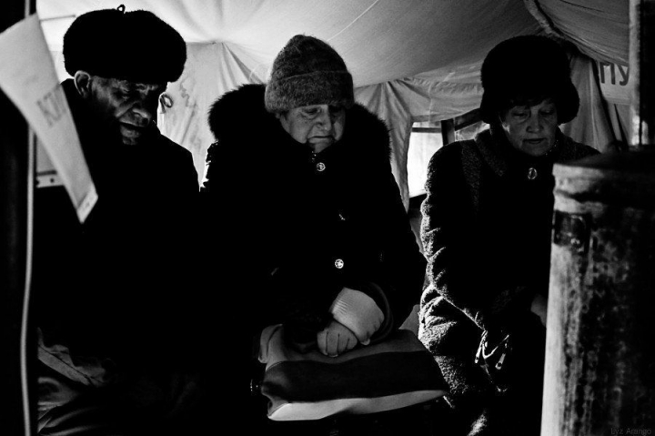 Una anciana llora frente a la cola para cruzar la frontera hacia la autoproclamada República Popular de Lugansk. Tiene una discapacidad de segundo grado y sus piernas no resisten más horas en pie bajo las heladas temperaturas del invierno ucraniano.